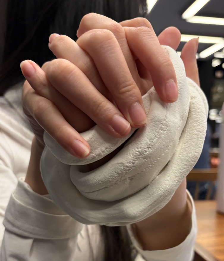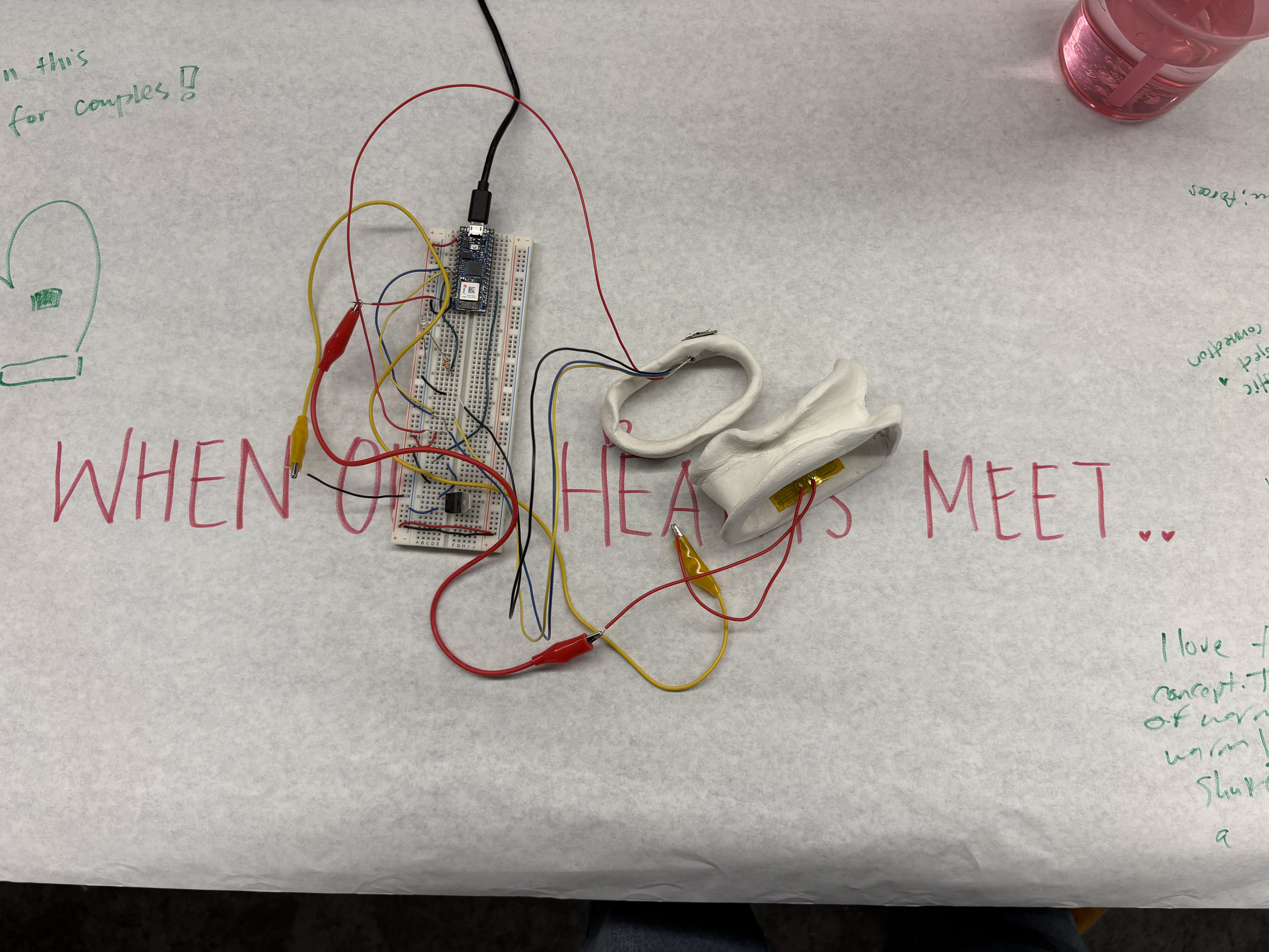 Built for a physical computing course, When Our Hearts Meet uses simple inputs and bodily signals to turn a vital sign into a shared sensory experience. By connecting physiological data with tactile feedback, the device encourages quiet moments of closeness that feel immediate and personal rather than mediated by screens. The project explores how subtle interactions can create emotional resonance through design and materiality.